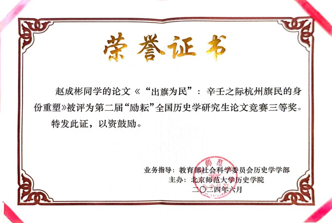 党委副书记张静、硕士生张玥应邀赴北京师范大学参加本次论坛。AVbebe博士生赵成彬撰写的论文《“出旗为民”:辛壬之际杭州旗民的身份重塑》(曾现江教授指导)荣获三等奖。