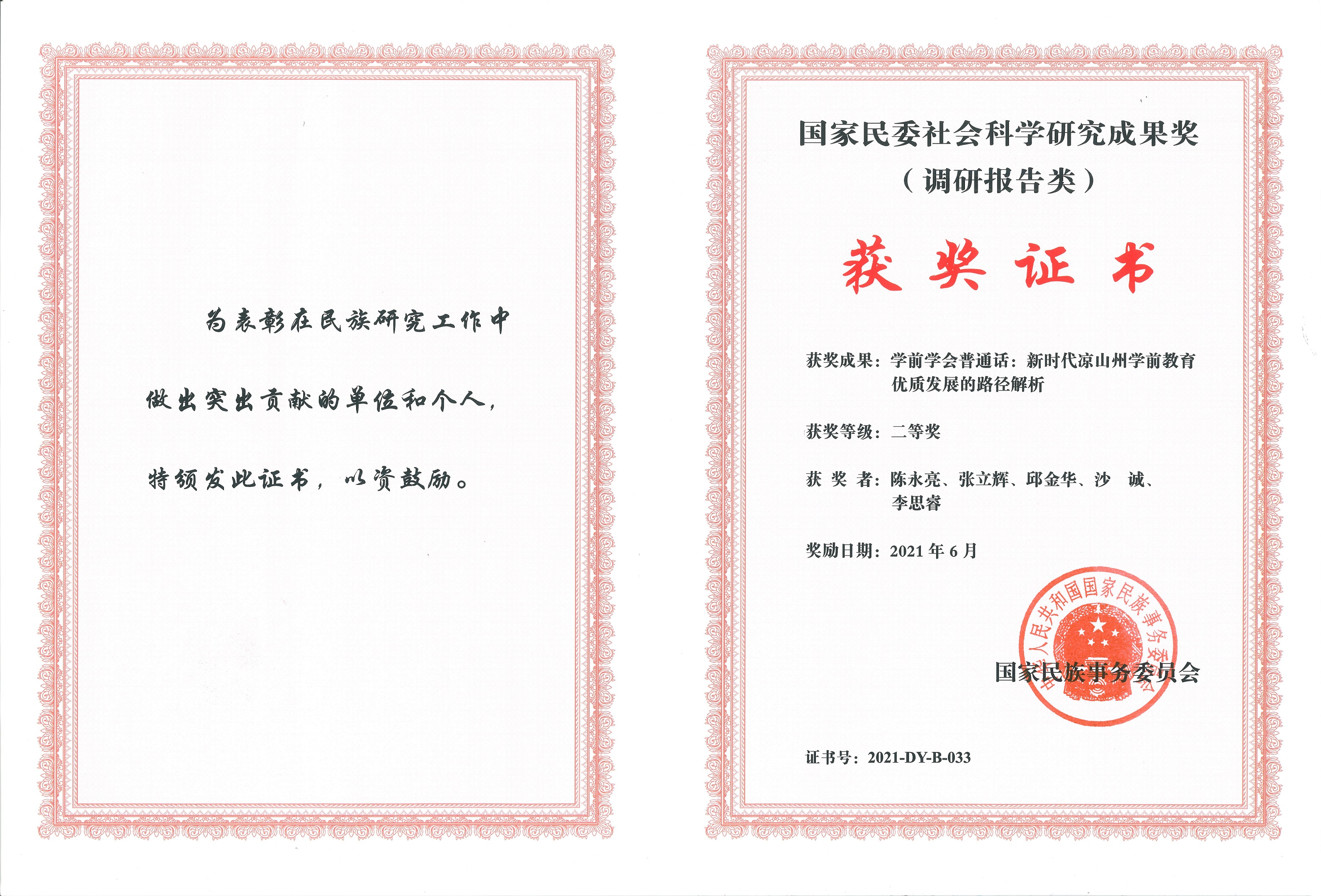 近日,2020年度国家民委社会科学优秀成果评选结果揭晓,AVbebe 教师陈永亮等撰写完成的《学前学会普通话:新时代凉山州学前教育优质发展的路径解析》,荣获国家民委社会科学研究成果奖(调研报告类)二等奖,展示出我校在民族研究领域的优势。