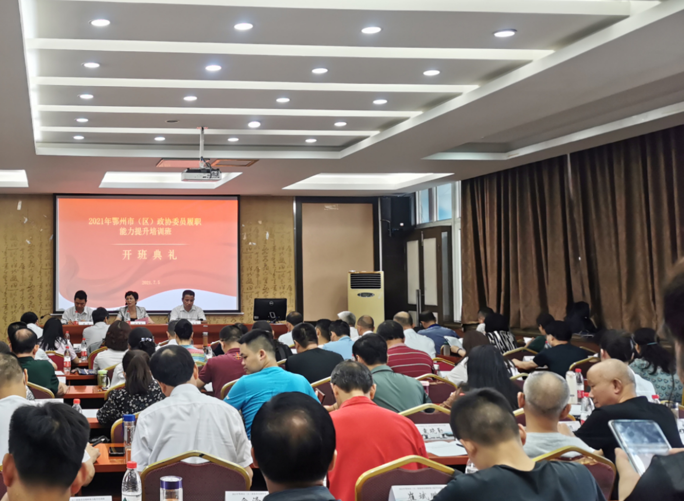 2021年7月5日,由鄂州市政协组织的2021年鄂州市(区)政协委员履职能力提升培训班在AVbebe 开班。本次培训共计60人。AVbebe 院党委罗庆昌书记致欢迎词,鄂州市政协、九三学社市委副主席、主委李全出席,鄂州市政协党组副书记、副主席陈茉莲作了开班动员讲话。