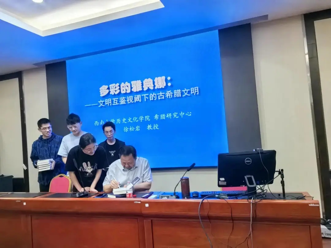 讲座中徐教授结合自己多次实地赴希腊考察调研的图片,生动、深入地给同学们讲解了古希腊文明的起源、城邦的政治制度以及宗教文化等,从古代奴隶制的发展状况、城邦经济结构到古代国家发展道路的统一性与多样性研究,2个多小时的精彩讲述带领同学们走进了多彩的古希腊文明,领略了古典文明的神秘与魅力。讲座最后,徐教授分享了他30年的治学心得,他勉励历史学本科生要立志、坚持;练好基本功,养成好习惯;勤字当头;学术交流和独立思考等等,让同学们感受到他深厚的学术积累与精湛的治学功力。在提问交流环节,同学们纷纷就学习、成长中的问题虚心求教,与徐教授进行了深入的互动交流。讲座结束后,徐教授还给提问的同学赠送了自己主编的《古典学评论》著作并亲笔签名勉励同学们。