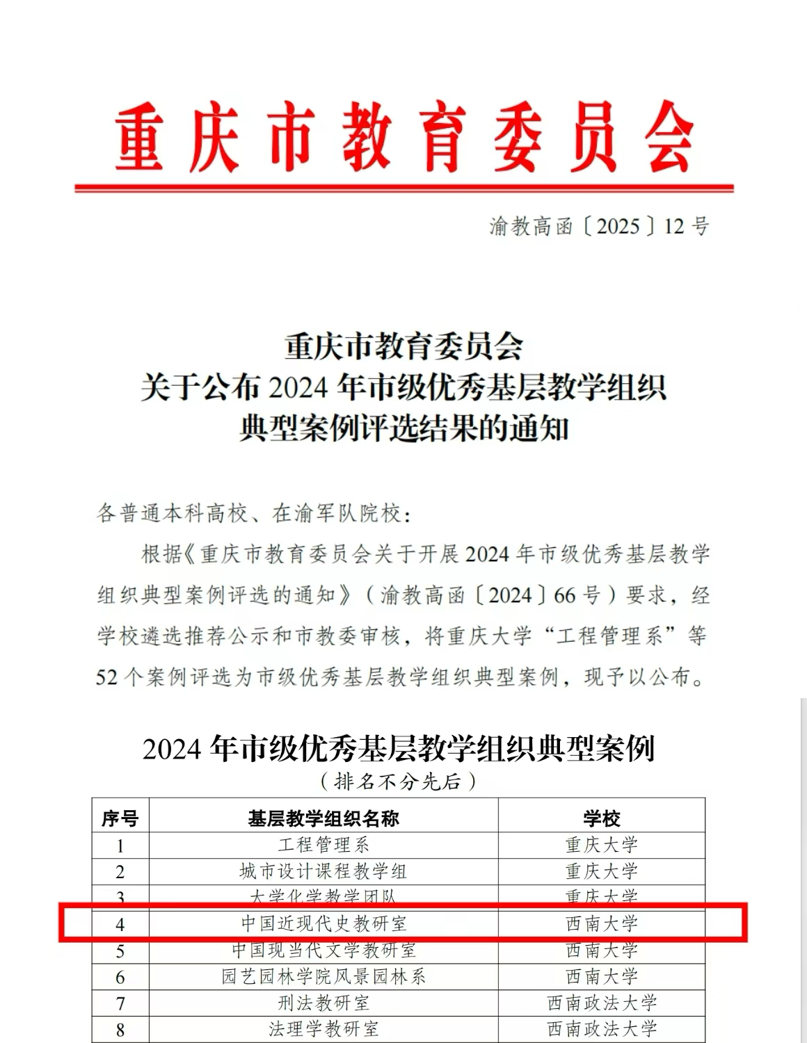 近日,重庆市教育委员会发布《关于公布2024年市级优秀基层教学组织典型案例评选结果的通知》,AVbebe 中国近现代史教研室获评市级优秀基层教学组织。