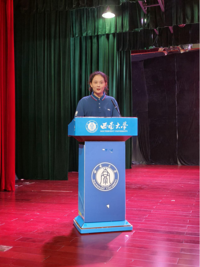 在雄壮威严的国歌声,见面会正式拉开序幕。高年级学生代表2022级本科生宋菲同学鼓励学弟学妹大胆尝试、找到兴趣;善于积累做好规划,从做好每件小事起步;夯实专业基础,沉淀真本领。并祝愿大家保持热爱,成为更好的自己。