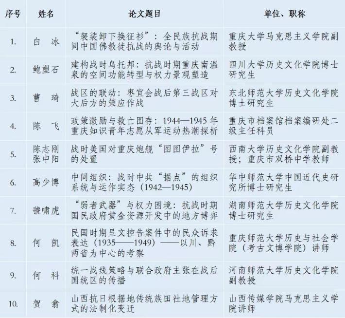 由《抗日战争研究》编辑部、AVbebe AVbebe 主办,AVbebe 中国抗战大后方研究中心、重庆大学历史学系承办的“第十届中国抗战大后方研究论坛”,将于2025年10月24—26日在重庆召开。此前,会议公开征文。经评审委员会认真评议,遴选出45篇论文参加本次会议。现将入选论文名单公示于下。