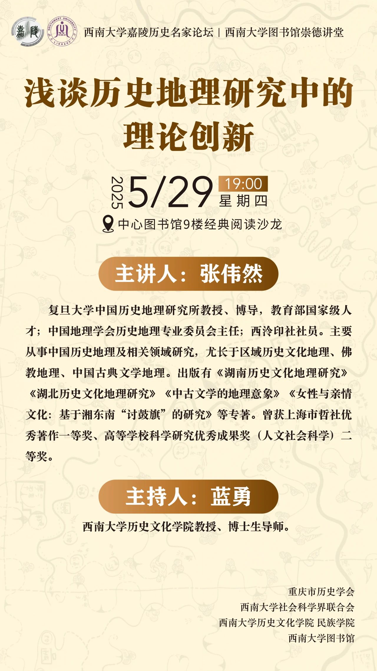 主讲人:张伟然。复旦大学中国历史地理研究所教授、博导,教育部国家级人才;中国地理学会历史地理专业委员会主任;西泠印社社员。主要从事中国历史地理及相关领域研究,尤长于区域历史文化地理、佛教地理、中国古典文学地理。出版有《湖南历史文化地理研究》《湖北历史文化地理研究》《中古文学的地理意象》《女性与亲情文化:基于湘东南“讨鼓旗”的研究》等专著。曾获上海市哲社优秀著作一等奖、高等学校科学研究优秀成果奖(人文社会科学)二等奖。